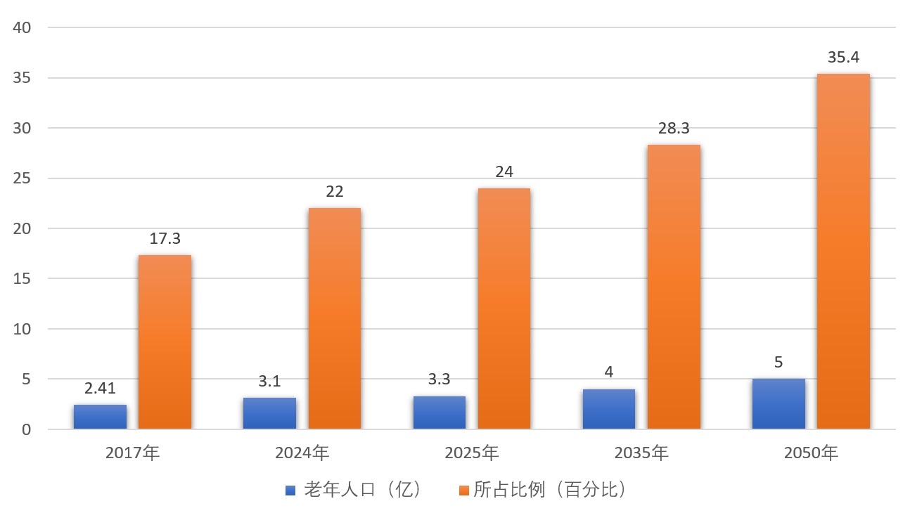 我國確立了“以居家為基礎、社區為依托、機構為支撐”的養老產業框架和9073養老格局,90%居家養老;2025年1月17日,國家統計局發布,截至2024年底,我國60歲及以上老年人口有3.1億人,占總人口22%,其中,65歲及以上人口超2.2億人,占15.6%。2035年左右我國60歲及以上老年人口將突破4億,在2050年前后達到頂峰,約占總人口的1/3。那時,中國將有4.8億、甚至接近5億老年人,是世界上老年人口最多的國家。養老服務業目前已超20萬億市場規模。